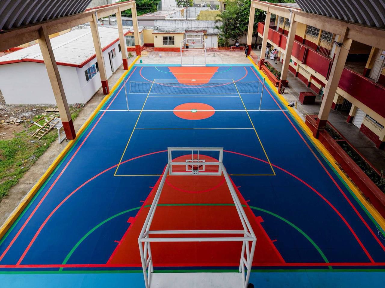 La rehabilitación incluyó más de 400 metros cuadrados de pavimento de concreto premezclado de 12 cm de espesor, el uso de más de 60 metros cúbicos de base hidráulica, la colocación de 2 piezas de porterías-canastas y postes de voleibol, así como la aplicación de más de 400 metros cuadrados de pintura deportiva antiderrapante, entre otras acciones.