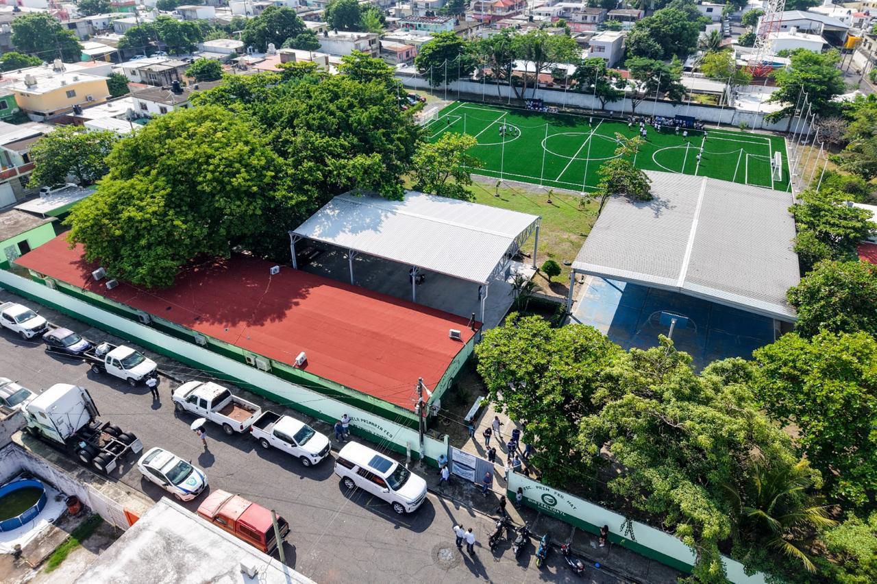 La nueva cancha cuenta con más de mil 800 metros cuadrados de pasto sintético tipo Tufting, resistente a temperaturas extremas, beneficiando directamente a más de 6 mil personas entre alumnos, docentes y padres de familia.